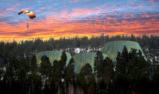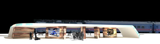 Syskonbyggnaderna för resecentrum och rastplats består av en varsin skiva som växer upp ur marken – vintertid en stiliserad snödriva, under barmarkssäsongen mossbelupen backe. Skivan bildar tak över knuttrimrade volymer med infoskyltar, digitala displayer, WC och annan service. De arkitektoniska komponenterna är snö, mossa, digital information knuttimrad hälsingefur och rovdjur.